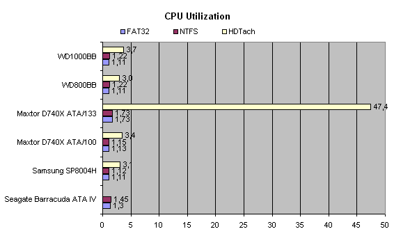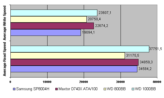 Файловая система посложнее, одной скоростью передачи по шине не обойдешься, тем не менее Maxtor D740X показал себя очень неплохо, правда, на фоне некоторого спада у WD1000BB.