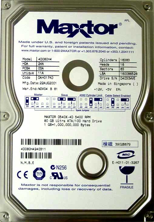 Как я уже писал, в линейке D540X на самом деле присутствуют две модели — разработки Maxtor и Quantum. Больше распространена модель от Maxtor c индексом «D». Ее мы и тестировали, что хорошо видно на фото. Стандартный корпус Maxtor плюс сигнальный процессор (DSP) — вот отличительные черты этой модели. Естественно, присутствуют Maxtor Data Protection System и Shock Protection System, а также система управления акустическими характеристиками. В линейку входят диски объемом 20, 40, 60 и 80 гигабайт. Плотность записи — 40GB на пластину, скорость вращения шпинделя — 5400 rpm. Мы тестировали диск объемом 80GB.