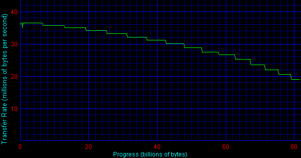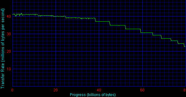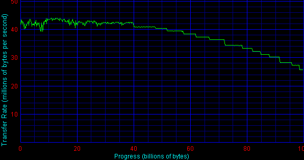 Различие в значениях скорости чтения в начале диска у Maxtor D740X объясняются легкой зубчатостью графика. У WD1000BB зубчатость побольше, зато и результаты отличные — скорость чтения выше 40000 tb/s на большей части диска! Приятно порадовал качеством график диска от Samsung.