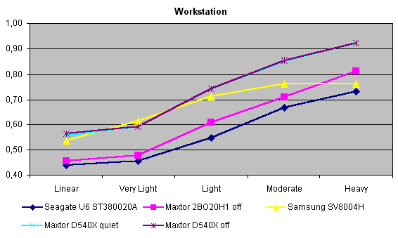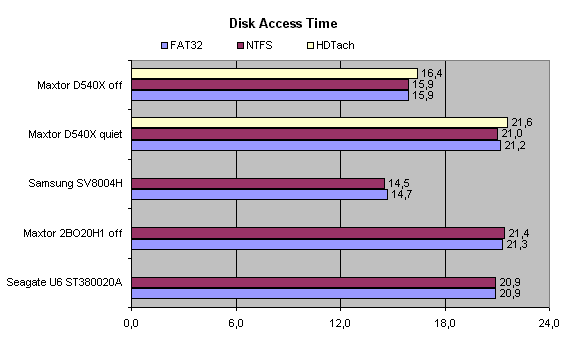 У D540X-4D включение «тихого» режима, как и положено, приводит к увеличению времени доступа, а вот с выключенным режимом управления акустикой новый диск от Maxtor занял второе место, причем результат существенно лучше заявленного (average seek 12.0ms + average latency 5.5ms = 17.5ms).