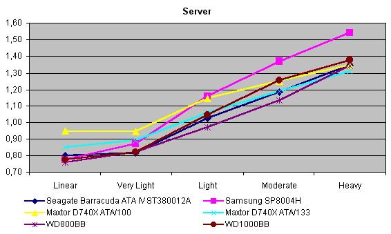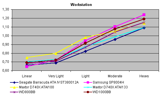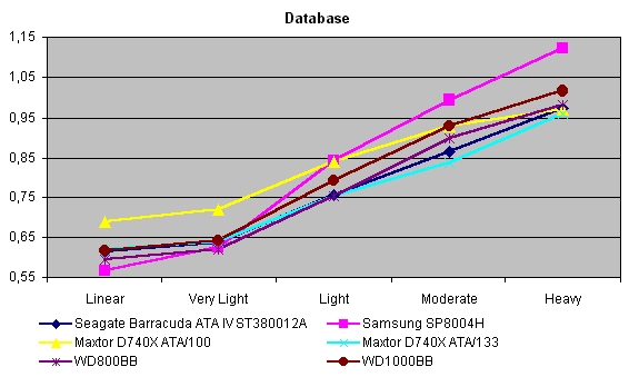 К лидерству дисков Samsung, особенно при высоких нагрузках, мы уже привыкли. Очень неплохо показал себя в этом тесте и WD1000BB. Maxtor D740X немного отстает, причем отставание при работе в режиме АТА/133 объясняется, на мой взгляд, исключительно особенностями контроллера HPT372.