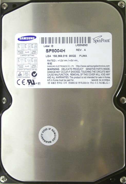 SP8004H — диск со скоростью вращения шпинделя 7200 rpm. Плотность записи — 40 GB на пластину, объем буфера — 2 МВ. В общем, Samsung уверенно включился в борьбу на самом высоком уровне. В линейку входят диски объемом 20, 40 и 80GB, мы тестировали сорока- и восьмидесятигигабайтные модели.