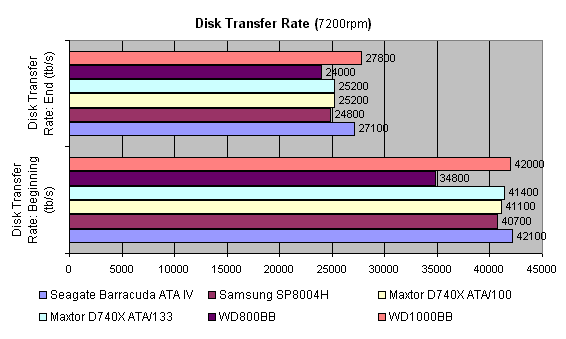 Чуть-чуть не дотянул WD1000BB до лидера — Seagate Barracuda ATA IV — по максимальной скорости чтения с пластины, зато отыгрался на скорости чтения в конце диска. Эти результаты показывают, что уменьшение плотности записи на пластину у WD1000BB произошло за счет сокращения числа треков. WD800BB по объективным причинам остался последним, а Samsung и Maxtor уверенно преодолели границу 40000 tb/s.
