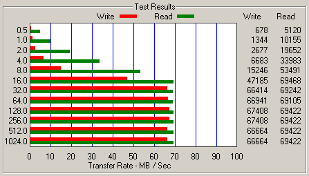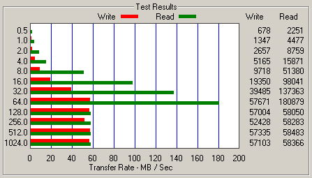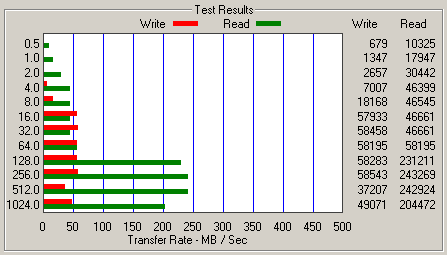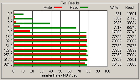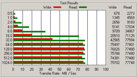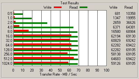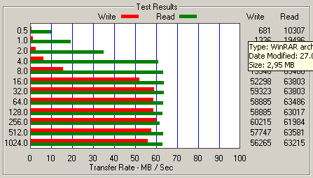 Другим показательным тестом «внутреннего устройства» дисков является тест на скорость чтения и записи файлов различного объема блоками разного размера — от 512 байт до 1 Мбайт. Для этого я традиционно использую тест ATTO Disk Benchmark. На скриншотах ниже показаны результаты для четырех размеров тестового файла — 128 (а также 256 и 512) Кбайт, 1 Мбайт, 4 Мбайт и 32 Мбайт. Если первый и второй, как правило, гарантированно кэшируются буфером диска (причем, кэширование записи и чтения для мегабайтного файла не так однозначно), то последний просто в него «не влезает», а кэширование предпоследнего зависит не только от объема буфера, но и от специфики работы firmware накопителя (кстати, результаты данного теста практически не зависят от выбора между FAT и NTFS).