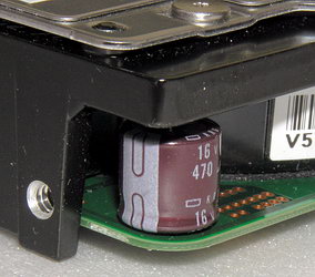 Корпус диска имеет несколько необычную форму, а в углах между платой и корпусом есть место для больших электролитических конденсаторов (наличие которых большая редкость для винчестеров вообще).