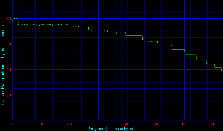 По максимальной скорости линейного чтения/записи (в самом начале диска) накопитель Hitachi Ultrastar 10K300 вроде бы почти равен лидеру — диску Maxtor Atlas 10K V — и явно быстрее, чем Seagate Cheetah 10K.7. Однако на самом деле оказывается, что до диска Maxtor нашему герою все-таки не так близко, поскольку Hitachi использует то же ухищрение, что и Seagate в Cheetah 10K.7 — небольшой начальный участок диска (с которого обычно загружается операционная система и большинство приложений) неестественно «поднят» по скорости. Впрочем, если по максимальной линейной скорости Hitachi Ultrastar 10K300 отстает от Maxtor Atlas 10K V всего на 3,4%, то по средней — лишь на 2% (а по минимальной — и вовсе на 0,2%), так что можно считать, что Хитачик и в среднем весьма достоин по линейной скорости, тем более что если Maxtor использует адаптивное форматирование, то Hitachi Ultrastar 10K300 — нет.