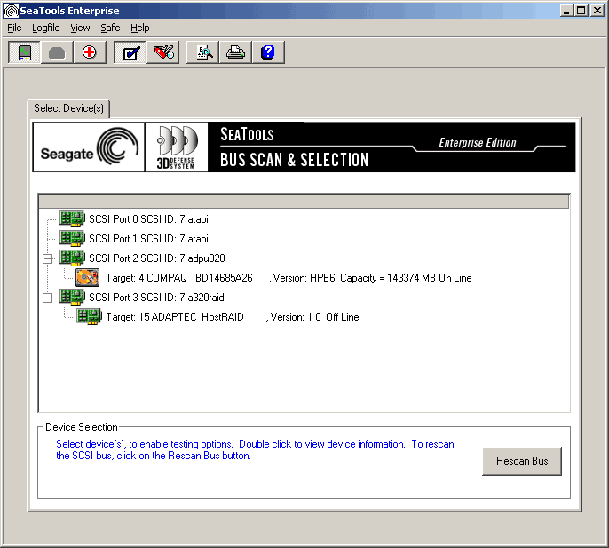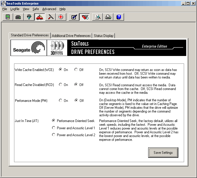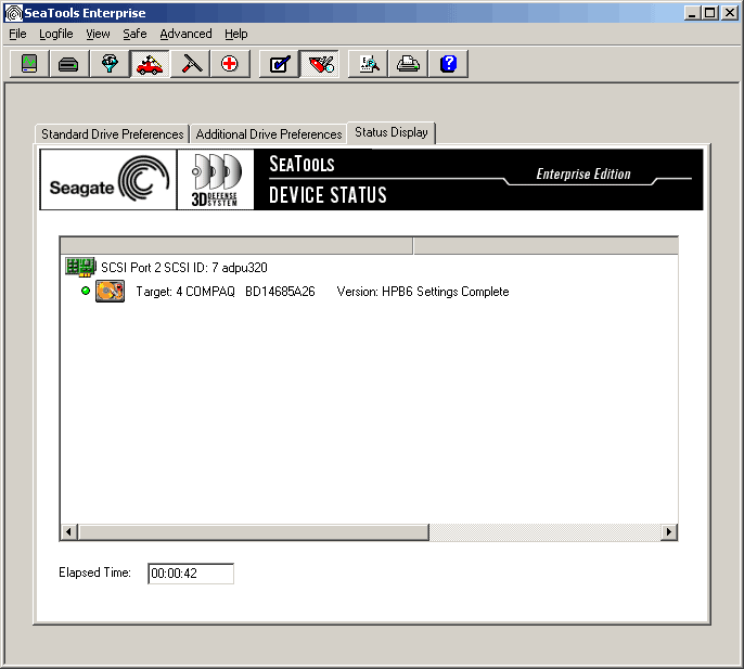 фирменная утилита Seagate Seatools Enterprise, предназначенная для управления параметрами SCSI-накопителей исключительно Seagate, не только прекрасно опознает этот диск (правда, тоже как продукт Compaq), но и позволяет оперировать его настройками прямо как продуктом Seagate, например, изменяя параметры кэширования и Performance Mode (кстати, поставляется этот накопитель HP с отключенным кэшированием записи).