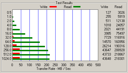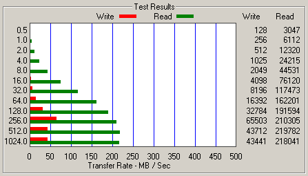 По результатам этого теста в глаза бросается крайне низкая скорость работы диска Hitachi с блоками малого размера при записи — особенно от 512 до 32768 байт. Это кореллирует с результатами предыдущего теста. В целом, проблемы «с записью» (точнее, с производительностью при записи) для firmware нового Ультрастара вырисовываются все четче. И это именно недоработки программистов Hitachi! К сожалению, и здесь вдвое больший буфер данных Hitachi не продемонстрировал своих преимуществ.