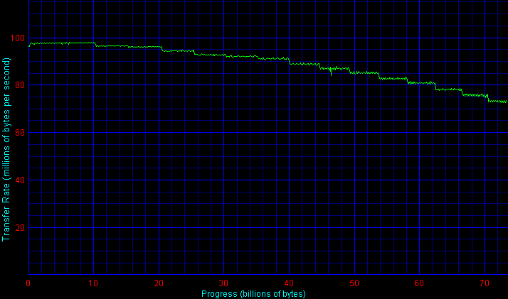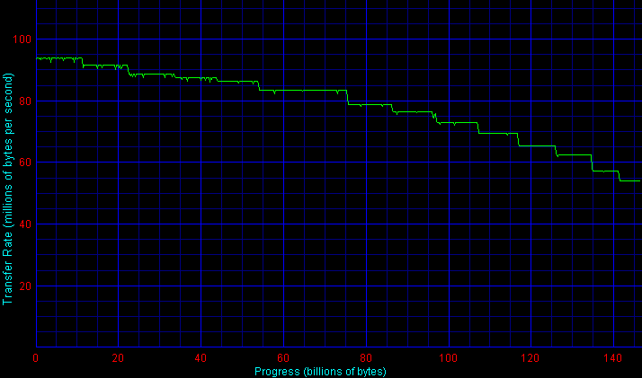 Адаптивное форматирование в дисках Hitachi этой серии не используется, поэтому и его признаков на графике скорости линейного чтения, построенном в высоком разрешении, у диска Hitachi Ultrastar 15K147 я не обнаружил. Таким образом, адаптивное форматирование, примененное в SCSI-дисках Maxtor последнего поколения, явно играет им на руку, обеспечивая непревзойденную скорость линейного чтения и записи.