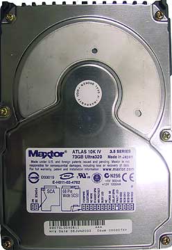 Диск относится к четвертому поколению десятитысячников от Maxtor'а. В этой линейке выпускаются диски размером 36.7, 73.5, 146.1GB с двумя типами интерфейса подключения: 68-pin Wide или 80-pin SCA-2. На тестирование попал диск размером 73.5GB, на что указывает число между буквами в наименовании модели. Интерфейс подключения — 68-pin Wide, буква «L» (диски со SCA-2 в наименовании модели имеют букву «J»). По заявлениям фирмы-производителя, по сравнению с предыдущим поколением SCSI-десятитысячников, на 24% увеличена скорость передачи данных и на 5% уменьшилось среднее время доступа. В диске использована технология Shock Protection System, собственно, из названия понятно, для чего она нужна. Также указывается на использование второго поколения интерфейса Ultra320 с технологией MaxAdapt — аналогом технологии Adaptive Active Filtration, что позволяет, по заявлениям Maxtor, снизить вероятность появления ошибок, упростить интеграцию и увеличить эффективность работы шины.