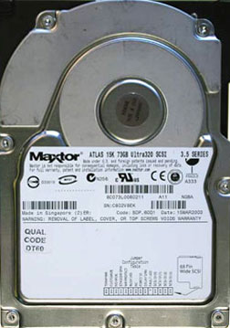 С первых строк технической документации Maxtor заявляет, что Atlas 15K — «The World's Fastest Hard Disk Drive» (именно так, все слова с большой буквы). Далее следует расшифровка столь агрессивного заявления, — оказывается, что имеется в виду среднее время доступа, равное 3,2 мс. Следует заметить, что старшая модель, как и у других производителей, имеет чуть большее время доступа, равное 3,4 мс. По сравнению с десятитысячниками указывается на 45%-й рост количества операций ввода-вывода в секунду. В диске также используется технология MaxAdapt и Shock Protection System. В линейке Atlas 15K присутствуют диски размером 18.4, 36.7 и 73.4GB, интерфейс подключения: 68-pin Wide или 80-pin SCA-2. На тестирование попал старший диск этой линейки с интерфесом 68-pin Wide.