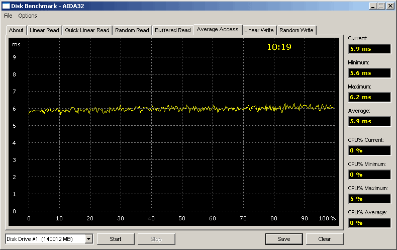 Попутно отмечу, что даже у этих enterprise-накопителей среднее время доступа может «плавать» во времени в зависимости, например, от нагрева, что наглядно демонстрирует следующий график среднего времени доступа, измеренный в AIDA32 для Seagate Cheetah 15K.4 в течение примерно 10 минут — от начала до окончания измерений среднее время доступа к диску возросло на 0,1-0,2 мс (кликните по нему, чтобы посмотреть полный скриншот).