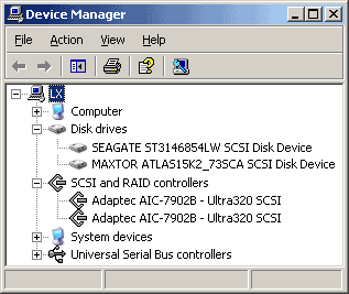 SCSI-диски подключались к системе (по одиночке!) коротким 20-сантиметровым кабелем (без терминатора, который есть в самом диске), чтобы минимизировать набег фазы на высокой частоте передачи интерфейса Ultra320 (а это — едва ли не главный бич современного SCSI, не позволяющий этой параллельной шине развиваться в более высокочастотную область), то есть добиться по возможности наилучшей скорости передачи данных по шине SCSI в нашей тестовой системе. В Device Manager'е Windows XP эти диски и контроллер выглядят так: