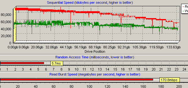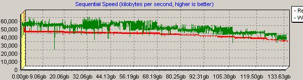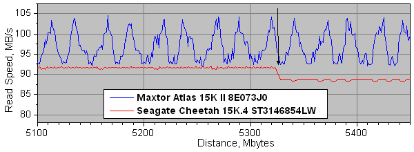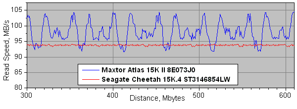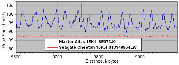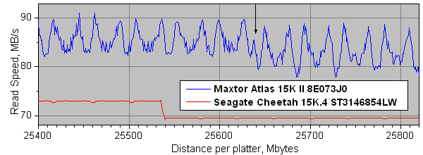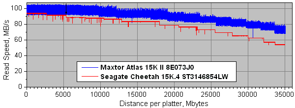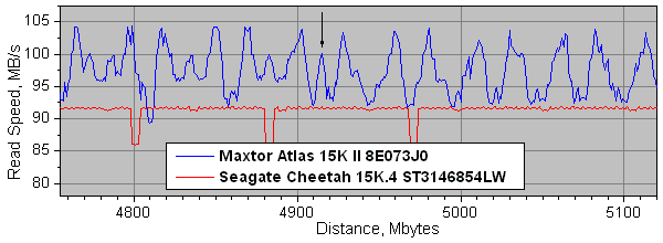 И хотя нельзя со стопроцентной уверенностью утверждать, что «адаптивное форматирование» НЕ применяется в диске Seagate Cheetah 15K.4 (поскольку разрешения нашего метода для этого недостаточно, да и транслятор физических секторов в логические может заметно исказить картину), скорее всего, это именно так, то есть в диске Maxtor из магнитных пластин «выжимаются последние соки» плотности и скорости (об этом говорит и гораздо более высокая минимальная скорость чтения при заданной емкости пластин), тогда как Seagate использует форматирование «по старинке» и ориентируется на заранее заданную плотность для этой технологии, не учитывая индивидуальных возможностей каждого экземпляра накопителя. С одной стороны — это явный скоростной плюс для дисков Maxtor, но с другой — диски этого производителя даже из одной партии могут заметно различаться по скорости линейного чтения, что дает некоторый разброс производительности даже внутри одной модели дисков.