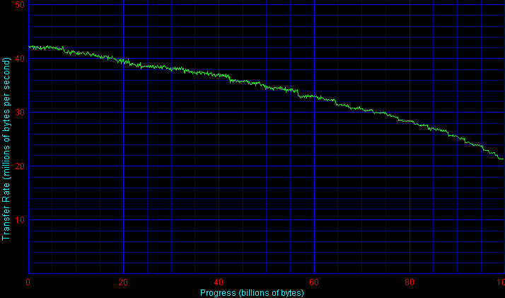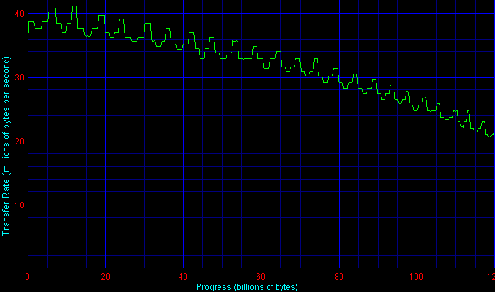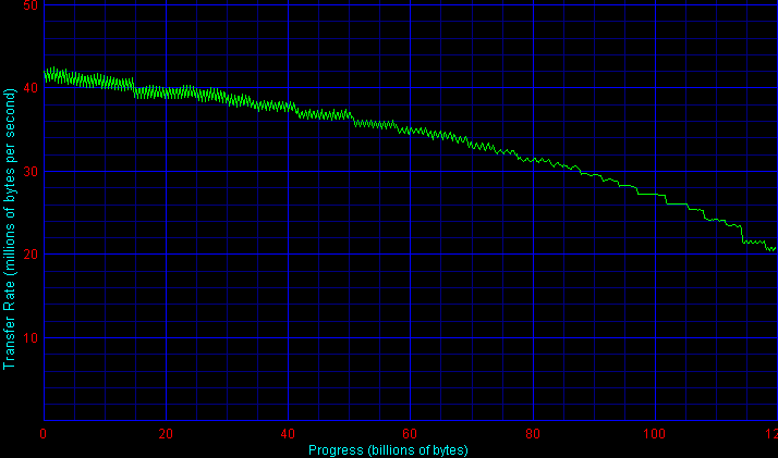Как видим, скорость линейного чтения у двух испытанных нами экземпляров модели ST9160821A заметно различается — на 4% на начальных дорожках и примерно на столько же в среднем по объему диска. Общие графики с отсутствием четкого зонного распределения свидетельствуют о применении в этих накопителях адаптивного форматирования, причем адаптивно меняется не только линейная плотность записи вдоль дорожки (BPI), но и количество дорожек вдоль радиуса (TPI), а также разбиение на зоны для каждой магнитной поверхности. Впрочем, индивидуальность разбиения на зоны здесь не полностью произвольна и выбирается всего из нескольких предусмотренных таблиц, поэтому в некоторых случаях, когда все магнитные поверхности и головки в накопителе имеют примерно одинаковые характеристики, общий график получается с достаточно четко выраженными зонами форматирования, как, например, для второго (более медленного) из испытанных нами накопителей ST9160821A (правый верхний график выше).