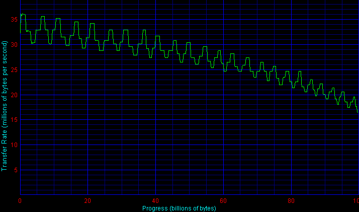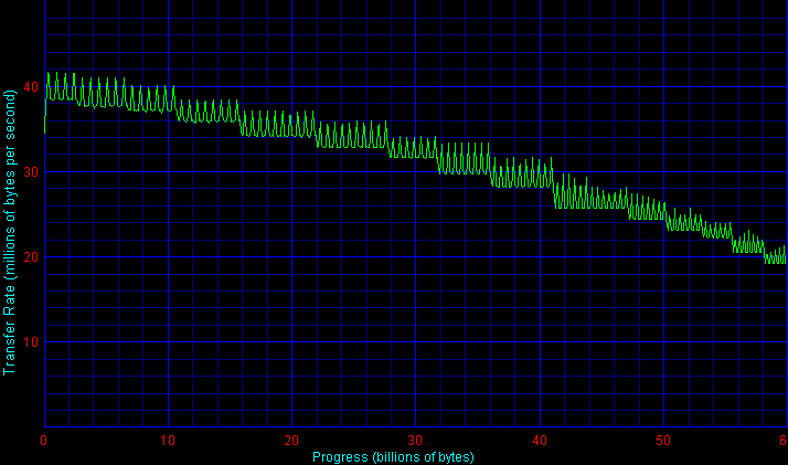 Как вы уже догадались, отсутствие «зубцов адаптивного форматирования» на приведенных выше графиках линейного чтения для дисков Seagate объясняются малым периодом чередования головок в трансляторе адресного пространства. Если же эти графики нарисовать в более высоком разрешении по горизонтали, то «зубцы» появятся во всей красе: