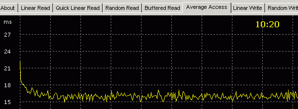 Напомню, что ранее похожее поведение мы могли наблюдать у настольных винчестеров Maxtor нескольких последних поколений, и там оно объяснялось самокалибровкой накопителя во время примерно 1000 начальных циклов доступа. Интересно, что похожий подход стала использовать и Seagate в своих новых Momentus 5400.3, и может благодаря этому мы и наблюдаем у них рекордно быстрый устоявшийся поиск.