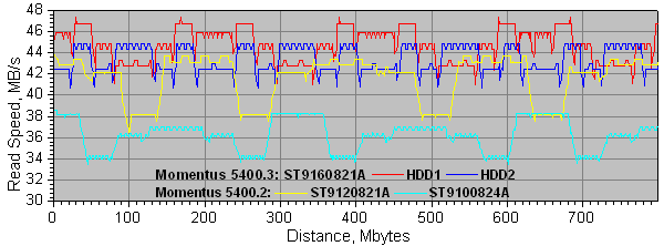 Перейдем к испытаниям. За честь Momentus 5400.3 и первой реализации PMR в мобильных пятитысячниках вступаются сразу два экземпляра старшей 160-гигабайтной модели ST9160821A. Дело в том, что из-за применения адаптивного форматирования пластин реальная скорость линейного доступа может колебаться от экземпляра к экземпляру одной и той же модели, поэтому мы решили подстраховаться и оттестировать накопители, заметно различающиеся по форматированию, чтобы понять, насколько велик может быть реальный разброс скорости между дисками одной и той же модели.