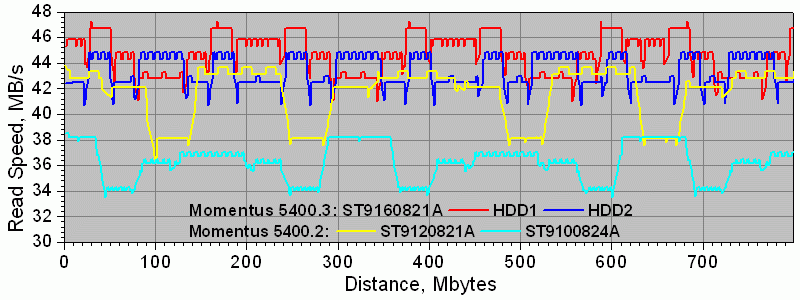 В результате перехода на PMR старшим накопителям серии Momentus 5400.3 удается таки обогнать всех своих предшественников и конкурентов по скорости линейного доступа, получив в некоторых экземплярах до 45 млн. байт в секунду при последовательном чтении данных. Впрочем, это не такое уж большое преимущество над теми же Momentus 5400.2 или Hitachi Travelstar 5K100, демонстрирующими скорость до 42 млн. байт в секунду, особенно если учитывать, что часть экземпляров Momentus 5400.3 обладает более низкой скоростью — на уровне предшественников.
