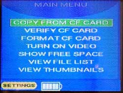 Digital Album в этом плане устройство более продвинутое. Процесс передачи данных инициируется выбором пункта меню «Copy», который расположен самым первым, так что лишних телодвижений производить не придется. Точно также создается новый каталог, затем начинается сама передача; за процессом можно следить по ЖК-дисплею. По окончании нам будет сообщено, сколько файлов, и в какой каталог было скопировано. После окончания переписывания рекомендуется выбрать следующий пункт меню, а именно «Verify» (в принципе, это можно сделать в любой момент, но проверяется только последняя операция, так что откладывать смысла нет). Устройство само произведет проверку. Проверка проходит быстро: сравниваются названия файлов, размер и некоторые иные характеристики, чего вполне достаточно, а не содержимое с точностью до байта. Если проверка пройдет успешно, устройство само предложит очистить карту. Если нет, желательно повторить процедуру записи и проверки. В случае, когда все сделано именно так, извлеченная из устройства карта сразу же «годна к употреблению» — вручную ее очищать не придется. В принципе, устройство способно еще кое на что, однако для полного доступа к файловым операциям его нужно подключить к телевизору — встроенного ЖКД недостаточно.