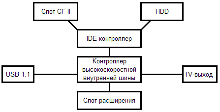 В следующем поколении схема стала немного сложнее… и проще. Сложнее, поскольку компонентов больше; проще, поскольку все они собраны в одном месте. Опять же, не показан модуль визуализации (который теперь еще и с ЖК-экраном работает), поскольку не так уж и важно, где он находится. Становится понятно, почему устройство так легко расширять: модули расширения подключаются к шине и становятся, фактически, частью устройства, имея доступ ко всем его компонентам. МР3-плеер будет «заказывать» музыку у винчестера, декодировать ее и выводить на выход для наушников (может, и на линейный), который появится при его подключении. Модуль печати — получать готовое изображение (или файл) и отправлять его на принтер. Модули высокоскоростных интерфейсов будут работать как простые посредники между внутренней шиной и FireWire, USB 2.0 или Ethernet. С какой скоростью работает шина? Точно не знаю. Если бы на момент тестирования был доступен хоть один из высокоскоростных модулей, можно было бы получить какие-то цифры, а так можно лишь предполагать, что скорость составляет два-три десятка мегабайт в секунду (иначе бы не стоило и огород с расширением городить). На ближайшее время этого достаточно — внутренняя шина узким местом пока явно не является.