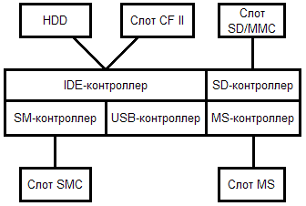 Начнем с Digital Album. Здесь все просто: главным управляющим элементом является высокоскоростной контроллер, который обеспечивает обмен данными между компонентами. Скорость обмена данными между винчестером и картой памяти лимитируется разве что контроллером IDE, т. е. на практике почти неограниченна. Есть и еще один компонент, не показанный на схеме (не знаю точно, отдельный ли он, и если да, то в какой части находится), отвечающий за декодирование JPEG и других форматов в целях визуализации файлов. Однако без дока устройство достаточно примитивно: данные могут уйти лишь на слот для его подключения.