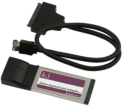 Но, разумеется, этого всего достаточно мало. А оборудование, рассчитанное на порт Power eSATA, уже начало появляться, так что и нам в лаборатории потребовалось уже что-нибудь такое эдакое. Причем идея со сменой материнской платы на тестовом стенде как-то не прельщала. Попытка найти контроллер с интерфейсом PCIe (или, на худой конец, PCI) с Power eSATA успехом не увенчалась — с «простым» eSATA их множество, но от этого не легче. Выяснилось, что компания Kanguru свою флэшку, рассчитанную на этот интерфейс, продает в комплекте со специальным кабелем-переходником, превращающим пару портов eSATA и USB в порт eSATA. Но продукция этого производителя не поставляется к нам на рынок, а найти такой кабель отдельно не удалось. Зато нам посчастливилось обнаружить в продаже столь необходимый адаптер в формате ExpressCard. А поскольку поддержка этого ноутбучного интерфейса к нашему тестовому стенду была уже «прикручена» ранее (когда потребовалось протестировать флэш-накопители в этом формате), так что это оказалось решением проблемы.