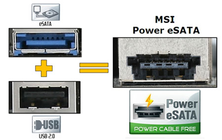 Мы взяли картинку с сайта компании MSI, поэтому о ней и упоминаем. На самом деле, «Power eSATA» хоть и не является уже принятым межотраслевым стандартом, но вряд ли стандартизация за горами — очень простое решение, тем более уже используемое не одним производителем, а несколькими. Правда, несколько менее активно, чем хотелось бы. В частности, MSI применяет порты такого типа пока всего в одной модели материнских плат (MSI 790FX-GD70 под АМ3) и в восьми моделях ноутбуков. И у других производителей есть ноутбуки с Power eSATA, а наиболее активным пользователем этой технологии среди производителей материнских плат является компания ASRock — все три модели на чипсете Х58, и одна — на Р45 снабжены таким портом.