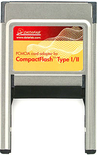 По сути, это всего лишь пассивный переходник CF-PCMCIA, поскольку эти типы карт (если рассматривать PCMCIA в узком смысле) логически и электрически совместимы. Это дает нам низкую цену на уровне 5-7 долларов и достаточно высокую скорость работы — на уровне 16-разрядной шины PCMCIA, что заведомо выше, чем у большинства универсальных интерфейсов вчерашнего дня. Однако достаточно ли этой скорости для конкуренции с новыми шинами? Это-то мы и проверим на практике. Скорость можно было бы повысить, отказавшись от пассивной схемы и перейдя к мосту PCMCIA-CF, использующему все 32 разряда новых версий PCCard, однако никто из производителей этим пока не занялся. Таким образом, все подобные адаптеры сейчас идентичны. Я использовал переходник от DataFab.