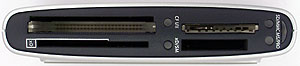 Вид спереди уже интереснее: хорошо заметен комбинированный слот xD-SMC, по причине своей новизны даже отдельно подписанный. Еще к особенностям устройства можно отнести целых пять светодиодов, один из которых сообщает о подключении питания, а остальные четыре связаны с соответствующими слотами картовода. Светодиод загорается всегда, когда в устройство вставлена карта, и мигает при обмене данными с ней. Такая раздельная индикация достаточно удобна, поскольку, например, сразу позволяет локализовать проблемы, типа неполной установки карты или установки ее не той стороной (что со SmartMedia сделать достаточно легко). Цену устройства раздельные индикаторы повышают буквально на пару центов, однако большинство производителей, почему-то ими пренебрегают, несмотря на все плюсы такого варианта (ранее подобный подход к индикации мы встречали лишь в DataFab ML4-USB2).