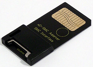 Адаптеры с интерфейсом CompactFlash и, тем более, PCMCIA зачастую имеют размеры, не превышающие габариты соответствующих карт. В данном случае на подобное рассчитывать нельзя, поскольку карты SmartMedia являются самыми тонкими. Отсюда и внешний вид — интерфейсная часть идентична SMC, а к ней «приделан» слот для xD. Вся конструкция имеет размеры 36,6×70,7×6,8 мм при массе 15 г. Да, и внутри конструкция проста — должные контакты xD соединяются дорожками с соответствующими для SM. Никаких контроллеров внутри нет — просто пассивный переходник. Заработает или нет он в устройстве — зависит только от самого устройства.