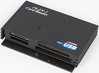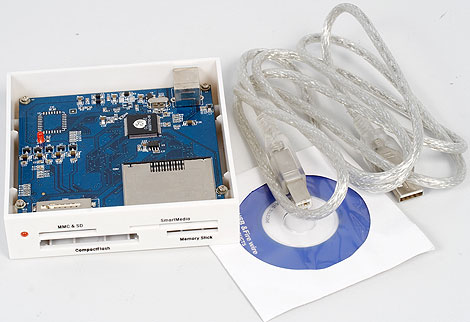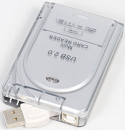 Открывает наш парад классика продукции «скромных» производителей, не рвущихся к известности. Единственной интересной особенностью данного устройства можно считать крышку, которая, по замыслу конструкторов, при транспортировке устройства должна закрывать слоты от попадания мусора (подобная была у Lexar Multi-Card Reader). В остальном ничего нового — давно привычная прямоугольная коробочка с четырьмя слотами для всех основных типов карт памяти, за исключением их компактных модификаций, да USB-разъем типа mini-B на противоположной грани.