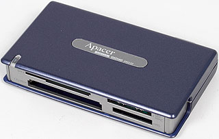 Согласно утверждениям Apacer, данный картовод поддерживает 23 типа карт. Как получаются все эти дикие количества, я в свое время писал. Как видим, даже крупные фирмы гонка за попугаями не миновала. Да и не могла она их миновать — можно честно написать нечто типа «12 in 1», но попробуйте потом продать это, если рядом лежит внешне неотличимое, но вдвое более дешевое устройство, на котором написано «40 in 1». Поэтому гонка виртуальных вооружений будет продолжаться и дальше. И использоваться в ней будут все средства.
