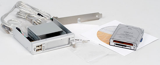Сам картовод невелик, так что легко поместится, например, в карман рубашки. Снабжен двумя слотами, чего все равно достаточно (благодаря их конструкции) для поддержки всех современных типов флэш-карт. Кое-чем, конечно, придется жертвовать — в данном случае прямой совместимостью с картами уменьшенных размеров: их придется использовать совместно с переходниками, но тут ничего не поделаешь. Сзади расположен поворотный USB-разъем, что при подключении к компьютеру позволяет обойтись без кабелей. А рядом с ним еще один разъем USB, но уже B-типа. Зачем он нужен? Через него осуществляется контакт с доком, устанавливаемым в свободный отсек для 3,5-дюймовых накопителей. Чудесное решение! При стационарном использовании никаких проводов, никаких коробок на столе — полноценное внутреннее устройство. Нужно его взять с собой? Нажимаем кнопку и получаем достаточно компактный мультиформатник, который можно подключить к любому компьютеру.