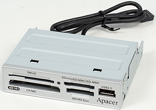 После появления спецификации USB 2.0, устройство было обновлено. Впрочем, одним лишь интерфейсом изменения не ограничились — на лицевой поверхности устройства появился сквозной USB-порт. Решение крайне правильное, поскольку на материнских платах порты USB расположены попарно, так что если занять один из них картоводом второй обычно пропадает. Данную модель мы тестировали 3,5 года назад, показала она очень неплохие результаты, но ничто не стоит на месте. Развитие карт памяти тоже. На смену SmartMedia пришел xD-Picture, ранний (неудачный) MemoryStick начал заменяться MemoryStick Pro, росли скорости и емкости карт — нужно было менять элементную базу картоводов. Apacer сделал это в моделях ER151 и ER161. Особых внешних изменений (по сравнению с оригиналом) не было — второй USB-порт вертикально развернули, да xD-слот добавили. Главное скрывалось внутри. Впрочем, про эти модели мы ранее ничего не писали, так что в дальнейшем упоминать их не буду — дабы не напутать чего-нибудь.