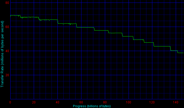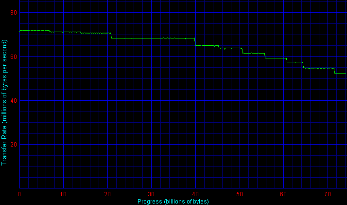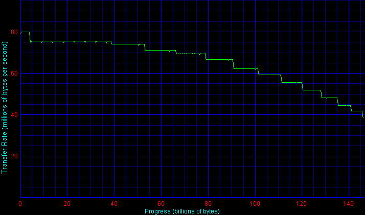 По максимальной устоявшейся (линейной) скорости чтения/записи полезных данных самые быстрые пластины оказались тоже (как и поиск) — у обеих серий дисков Maxtor Atlas (10K V и 15K II), то есть «по физике» диски Maxtor лидируют среди конкурентов (но и весят при этом заметно больше остальных). Хотя в целом соперники здесь близки — пятнадцатитысячники по линейной скорости уже перевалили за 90 Мбайт/с (на внешних дорожках), но пока не дотягивают до знаковой цифры в 100 Мбайт/с, а трехдюймовые десятитысячники в массе своей осилили барьер в 80 Мбайт/с, но пока не добрались до 90 (лишь Maxtor Atlas 10K V подбирается к этой цифре вплотную).