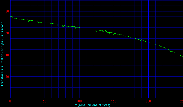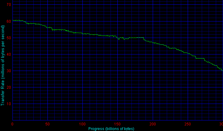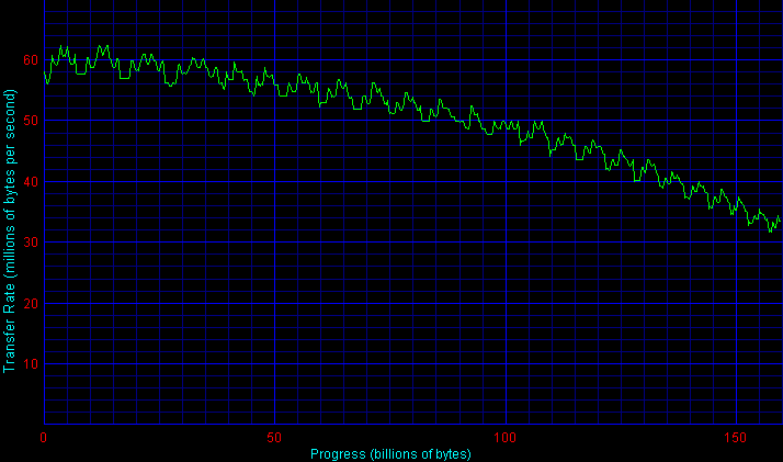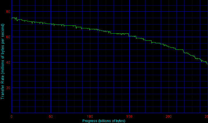 Вид графиков последних дисков Samsung привычным не назовешь: нет ни традиционноых гладких полочек с постоянной скоростью, ни размашистых периодических колебаний, как у SpinPoint P80 (хотя зонная структура четко прослежи вается везде). Напомню, что SpinPoint P80 на пластинах емкостью 80 Гбайт были в свое время первыми накопителями Samsung, в которых применили так называемую «elastic bits per inch» технологию (известную ранее также под именем «адаптивное форматирование» от IBM :)), когда каждая сторона поверхности магнитных пластин форматируется с индивидуально подбираемой линейной плотностью треков, чтобы наиболее полно раскрыть скоростной потенциал существующей на данный момент технологии магнитной записи, не потеряв при этом в надежности (головка с лучшими характеристиками пишет с большей плотностью, и наоборот, что позволяет удерживать на заявленном уровне объявленные величины BER (Bit error rate) и в какой-то мере — среднюю плотность записи для диска в целом, то есть эластичная BPI способствует улучшению качества и, по мере возможности, увеличению производительности винчестеров).