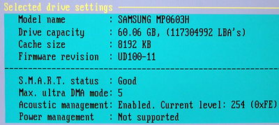 По среднему времени доступа все три модели Samsung также примерно одинаковы, хотя старшие все же слегка медленнее — головок-то побольше. Как я уже отмечал в обзоре модели MP0402H, накопители этой серии поддерживают управление акустиков через регистр Acoustics Management.