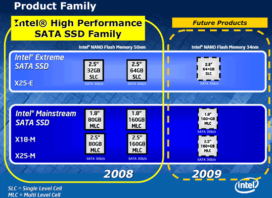 Посмотрим, что же Intel готова уже сейчас предложить покупателям. Как мы видим, семейство логически разбивается на три линейки, две из которых, различающиеся только форм-фактором (1.8 и 2.5 дюйма соответственно в «винчестерной» терминологии), нацелены на массовый сегмент рынка и построены на базе многоуровневых чипов флэш-памяти, а одно предназначается для наиболее требовательных пользователей и базируется на SLC. C этим связана и разница в объемах — MLC имеют большую емкость, так что уже доступны накопители 80 ГБ, а в конце года должны появиться модели на 160 ГБ, Extreme же стартует в конце года с емкостей 32 и 64 ГБ. Большего выжать из 50 нм чипов невозможно, но уже в следующем году нас ожидает переход на 34 нм с соответствующим ростом емкости и снижением стоимости — скорее всего, менее чем через год X25-M на 160 ГБ будет стоить дешевле, чем сегодняшний на 80 ГБ (более «тонкий» техпроцесс сам по себе снижает себестоимость в полтора раза, к чему добавится еще и ее снижение в процессе отладки производства).