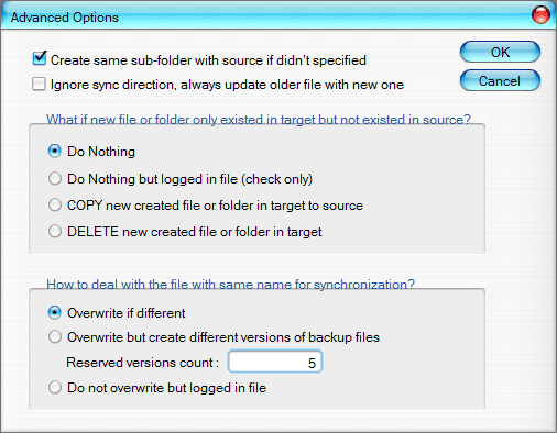 Более «хитрые» опции спрятаны от пользователя, но доступны при нажатии специальной кнопочки. Настроек не так много, но варианты выбора позволяют достаточно гибко менять поведение задач синхронизации. Описывать их подробно не стоит — все это сделано в руководстве пользователя на хорошем русском языке, да и многим нашим читателям понятно по скриншоту и без перевода.