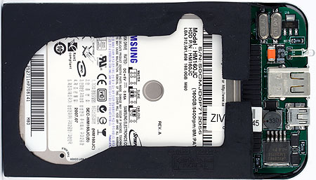Еще можно было увеличить емкость, точнее, не можно, а нужно. Хотя бы потому, что росла емкость самих устанавливаемых внутрь винчестеров, причем из-за увеличившейся плотности записи моделей малого объема нет в продаже. В результате, если в момент старта линейка ZIV Pro включала в себя модели емкостью от 30 до 60 Гбайт, то теперь она выглядит чуть иначе: 40, 60, 80, 100, 120, 160 и 200 Гбайт. Можно бы и больше, но пока компания продолжает использовать РАТА-винчестеры, а там больше 200 Гбайт не бывает. Впрочем, в планах переход еще в 2007 году на применение SATA HDD и увеличение емкости до 250 Гбайт, и далее, так что увидим мы «еще более новый ZIV Pro». С другой стороны, с потребительской точки зрения, от «нового» он отличаться не будет (если максимальный объем удовлетворяет), поскольку продается как законченное устройство, а производительность лимитируется внешними интерфейсами, а не внутренним. Кстати, заметим, что компания продолжает экспериментировать с поставщиками жестких дисков, с целью обеспечения наилучшего соотношения цена/качество. Ранее мы, в основном, встречались с винчестерами от Fujitsu, благо они чаще всего были «антирекордсменами» по энергопотреблению, а это требование компания ставит весьма жестко — ZIV обязан работать от одного порта USB в штатной ситуации и стараться это делать даже в том случае, если производитель материнской платы несколько «схалявил» на выдаваемой на порт силе тока. Однако и другие производители на месте последние годы не сидели, так что в прибывшем к нам на тестирование ZIV Pro емкостью 160 Гбайт был обнаружен винчестер Samsung HM160JC. Работает, как требуется, — от одного порта. Заметим, что на той тестовой системе наш Seagate Momentus 5400.2, используемый при тестировании отдельных внешних модулей, не во всяком из последних на такой «подвиг» способен, хоть и заметно меньше по емкости.
