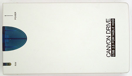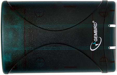 Mini оно только среди остальной продукции Gembird, размеры не разглашаются, но офицерская линейка показала, что равны они примерно 90×140×20 мм, так что вполне могут составить конкуренцию HandyDrive. Коробка пластмассовая, с претензией на дизайн, но… Особой свободы у дизайнеров не было: разместили на одном торце два индикатора (питания и активности винчестера), на другом — разъемы USB и питания и все. Тут ничего выдающегося не сделаешь.