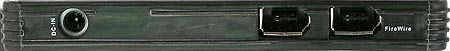 Если взглянуть на задний торец, то тут все и проясняется. USB-версия снабжена разъемом mini-B, разъемом для внешнего источника питания (в комплект не входит) и переключателем питания. FireWire-накопитель распознает источник питания автоматически, зато содержит целых два стандартных шестиконтактных порта IEEE1394: для связи с компьютером и сквозного подключения других устройств (что решает проблему, если у вас всего один порт, а устройства два).