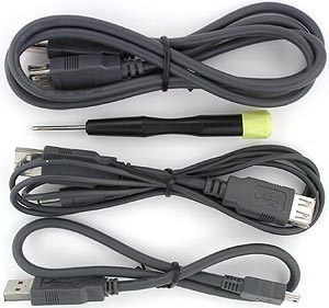 Для общения с внешним миром есть лишь один USB-разъем, да мигающая лампочка — индикатор активности устройства. Комплект поставки тоже минималистский: даже кабель всего один — с доппитанием от разъема клавиатуры, которое может и не пригодиться (впрочем, было бы хуже, если бы не было его, а был только «прямой»). На этом фоне странно выглядит отвертка — обычно это принадлежности ретэйловых дорогих вариантов.