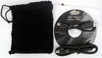В коробке также можно найти пару кабелей (очень коротких, поскольку и сам накопитель относится к очень компактным моделям), мешочек для его транспортировки и CD с документацией, драйверами и ПО. Последнее более ориентировано на пользователя Macintosh, а для машин под управлением Windows нашлась лишь программа для разметки диска, но так как она предназначена для работы под Windows 98, можно считать, что софта в комплекте нет вообще :)