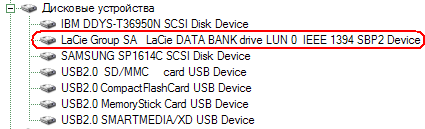Тип контроллера FireWire, однако, по списку устройств определить невозможно — все FW-накопители LaCie представляются по названию.