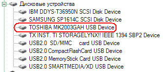 Подключение к USB-порту позволяет определить тип установленного в накопителе винчестера — это одна из моделей Toshiba. Согласно информации с сайта производителя, данная модель имеет частоту вращения 4200 об/мин и 512 Кбайт кэш-памяти (да — вот такие они пока скромные эти «малышки»).