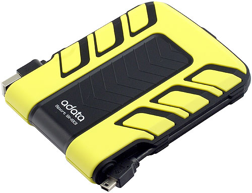 Данный накопитель даже не приходится специально разукрашивать, дабы привлечь к нему внимание — внешний вид и без того достаточно агрессивный. Желтый (или красный — есть две цветовых модификации) с черным резиновый корпус с откидывающейся заглушкой USB-порта сразу намекает на то, что перед нами защищенная модель, специально разработанная для нужд пользователей, ведущих активный образ жизни. И, действительно, в «послужном списке» SH93 не только тест MIL-STD-810F (точнее его часть, предполагающая падение устройства с высоты 122 см), но еще и IEC 529 IPX7, согласно которому устройство осталось работоспособным после погружения на глубину 1 м в течение 30 минут. Из этого, конечно, не следует, что с накопителем нужно нырять, однако можно предполагать, что падение в лужу он точно выдержит легко и не напрягаясь (что по весне в наших краях весьма актуально). Габариты, конечно, больше чем у предыдущего продукта компании, но вполне в пределах разумного — 129 х 97 х 19,2 мм при массе 240 грамм. И, что самое приятное, сохранена уже знакомая схема крепления 30 см USB-кабеля прямо к корпусу устройства, позволяющая не потерять его при транспортировке. При этом «окрестности» разъема посвободнее, так что проблем с использованием сторонних кабелей уже никаких.