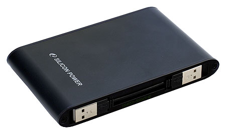 По сути своей эта модель является переходной между уже изученными нами A10/A50 и новейшим А80 с интерфейсом USB 3.0, с которым мы вас в ближайшее время познакомим. С первыми двумя накопителями, как несложно понять, А70 роднит интерфейс — всего лишь USB 2.0, с последней же дизайн. Изначально нам даже показалось, что накопители имеют одинаковые корпуса, в реальности же выяснилось, что они немного отличаются. Впрочем, подход сходный — в этих моделях конструкторы Silicon Power отказались от привычных разъемов mini-USB в пользу большой розетки А-типа. Решение имеет то неудобство, что такие кабели менее распространены, нежели «обычные». Но это компенсируется наличием в комплекте двух кабелей — один имеет стандартную длину (и поддерживает также питание от двух USB-портов), а второй — вместе с разъемами всего 10 см и при транспортировке устройства прячется прямо в прорезь на боковой грани корпуса. Наличие очень короткого кабеля, во-первых, позволяет уменьшить вероятность появления проблем с питанием, а во-вторых, должно очень порадовать пользователей ноутбуков, которым длинные кабели не нужны.