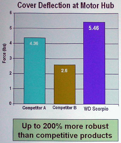 Так что дебют WD Scorpio состоялся как раз вовремя и от новых дисков можно ожидать немалых сюрпризов — ведь WD преподнесла за последние годы уже немало приятных сюрпризов в сегменте ATA-дисков. Да и над Scorpio инженеры корпорации поработали неплохо, «зарядив» его целым рядом новаций — например, высокой экономичностью (утверждается, что на уровне традиционных дисков с 4200 об./мин., хотя сами «Скорпиончики» — пятитысячники), бесшумностью работы и отличной ударостойкостью — лучшей среди прямых аналогов (см. ниже). Среди новаций и фирменных технологий, примененных в накопителях WD Scorpio, можно отметить уникальную технологию WD WhisperDrive с алгоритмами SoftSeek, которая позволила сделать диски WD Scorpio самыми тихими 2,5-дюймовыми дисками на рынке независимо от скорости вращения шпинделя. Передовая технология ShockGuard, сочетающая в себе ряд механических и программных новинок, позволяет защитить механизмы диска и высокочувствительные магнитные поверхности от повреждений при самых серьезных ударах, а дополнительная защита от ударов обеспечивается системой блокировки головок DuraStep Ramp (см. фото диска в начале статьи), в которой применяются самые совершенные на сегодня материалы, гарантирующие до 600 000 циклов блокировки без измеримого влияния на головки. Например, рампа для парковки головок с краю диска (см. фото выше) выполнена из нового устойчивого к микроповреждениям материала — полиоксиметилена. А специальная защелка (она видна справа вверху на фото в начале статьи) в обесточенном состоянии диска жестко фиксирует кронштейн с головками, чтобы он от сильного бокового удара не «выскочил» с рампы на пластину и не повредил ее поверхность и головки. Кроме того, в полтора раза больше гарантированное число аварийных парковок (30 тысяч против 20 тысяч у конкурентов), если питание диска внезапно пропадает и головки паркуются за счет остаточной энергии вращения шпинделя с пластинами. А прочная крышка из нержавеющей стали выдерживает давление до 2,25 кг без повреждения двигателя и других внутренних компонентов, что почти в полтора раза превышает средний показатель в отрасли — см. слайд ниже (конкуренты, как правило, используют крышки из сплавов алюминия). Это, в частности, позволяет более надежно защитить близко расположенные к верхней крышке головки от случайного нажатия на крышку — например, пальцами при монтаже.